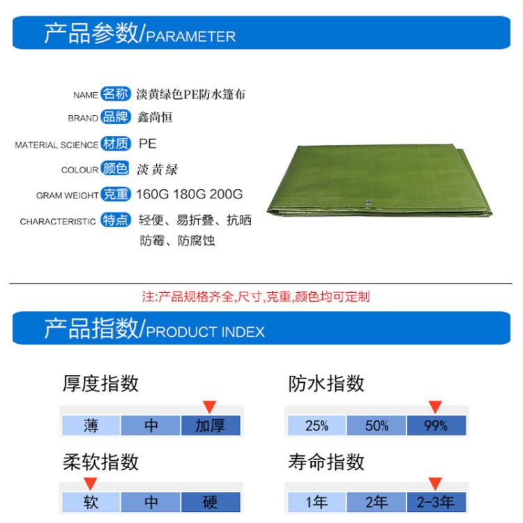 產(chǎn)品介紹淡黃綠色PE防水篷布產(chǎn)品參數(shù)淡黃綠色PE防水篷布PE材質(zhì)雙面防水,面料升級(jí),防雨不漏水,防曬抗老化,有效隔離水珠,做工精良使用···
