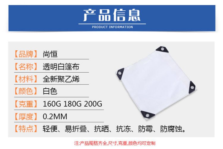 產品介紹透明白色PE防水篷布產品信息參數,篷布產品規格齊全,尺寸、克重、顏色均可定制。透明白色PE防水篷布產品細節,加厚包角設計。規···